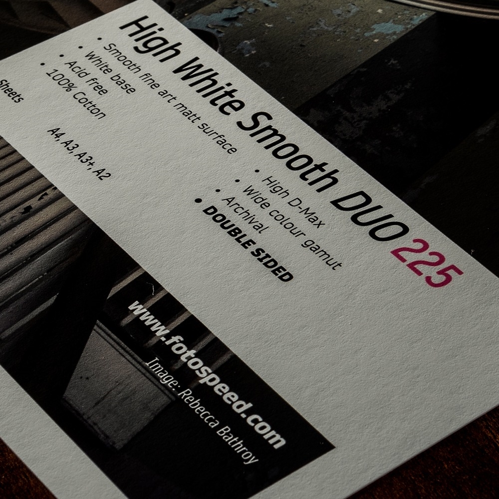 • Fotospeed High White Smooth Lite DUO 225 er 100 % bomull og pH-nøytralt Fine Art-papir med en tosidig glatt overflate. Dette papiret anbefales sterkt for gicleé-utskrift.