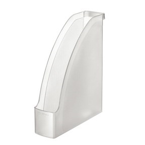 • Tidsskriftsamler Leitz Plus Standard, frost. Meget solid og attraktivt design. Kan plasseres både stående og liggende. Stor kapasitet innvendig (70 mm). Leveres med flyttbar etikettholder og etikett. Høy forkant for å unngå at papirene faller ut. Passer til A5-format.
